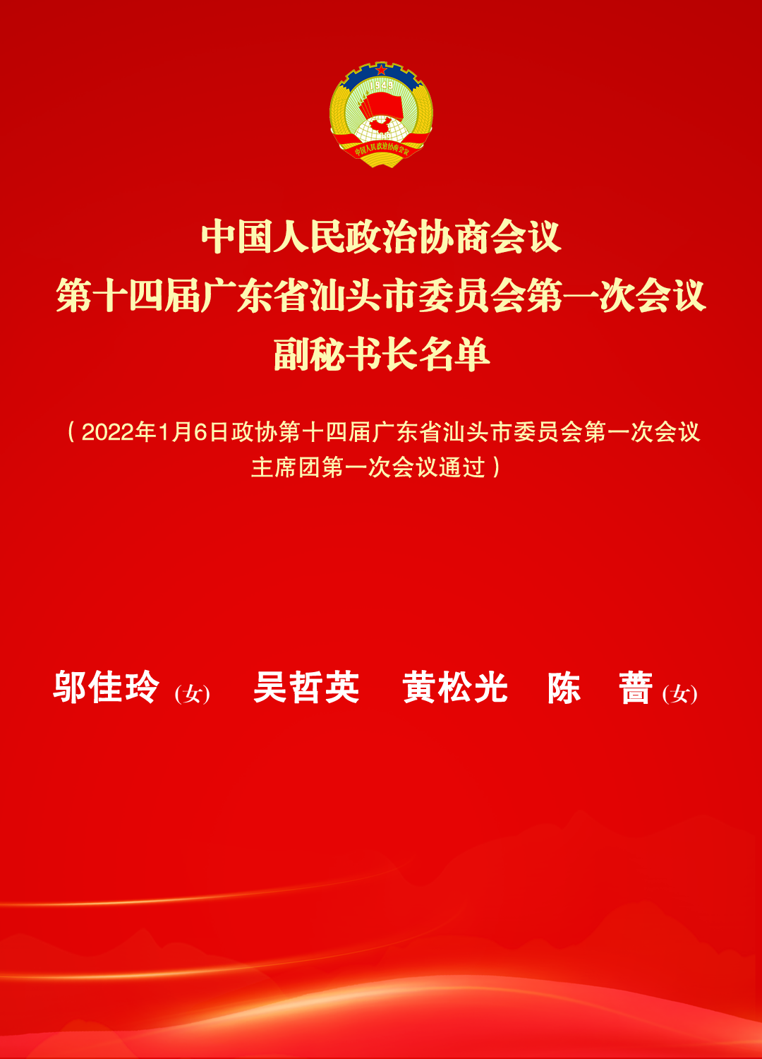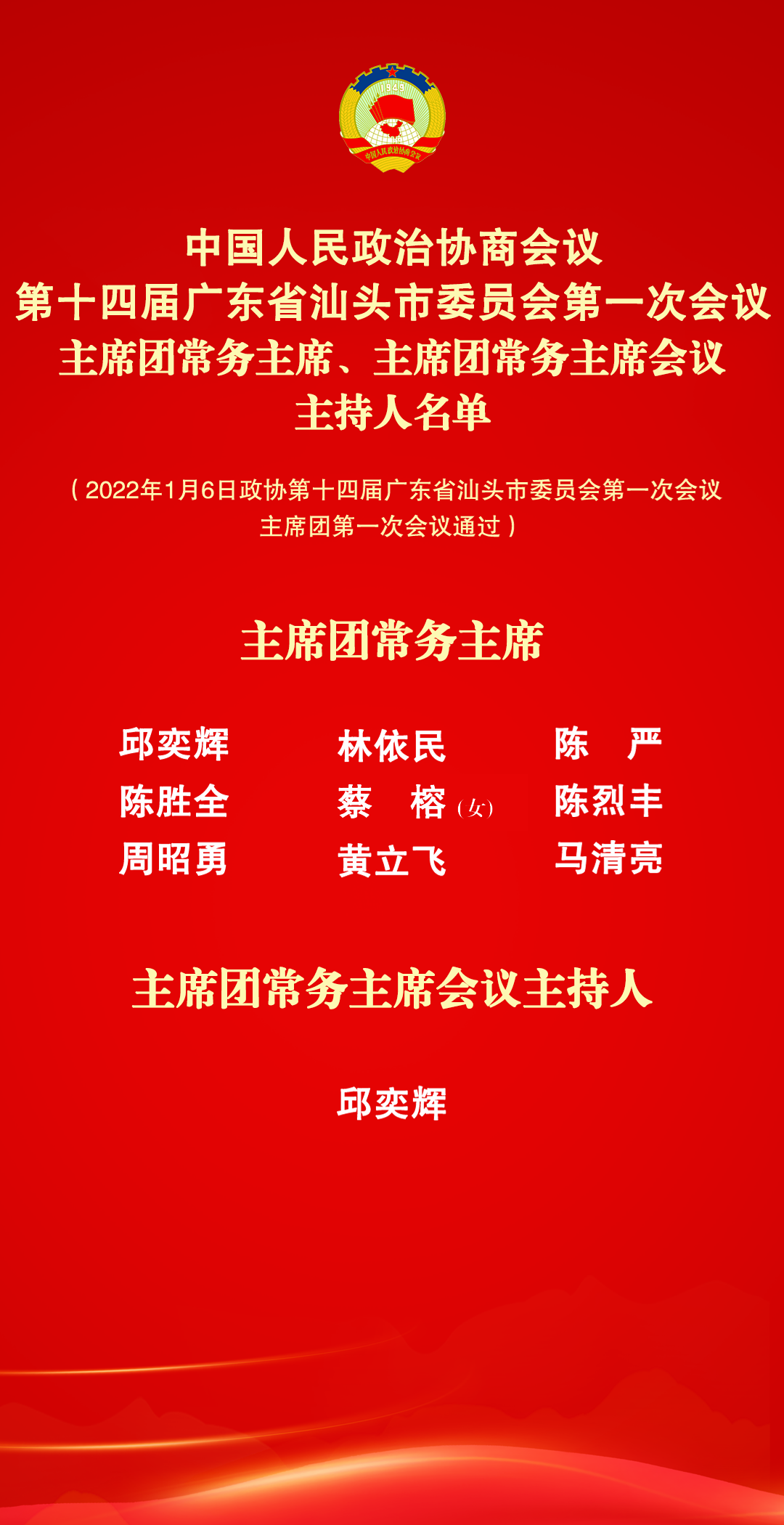 政协第十四届广东省汕头市委员会第一次会议主席团第一次会议1月6日下午举行。会议由主席团会议主持人邱奕辉主持。