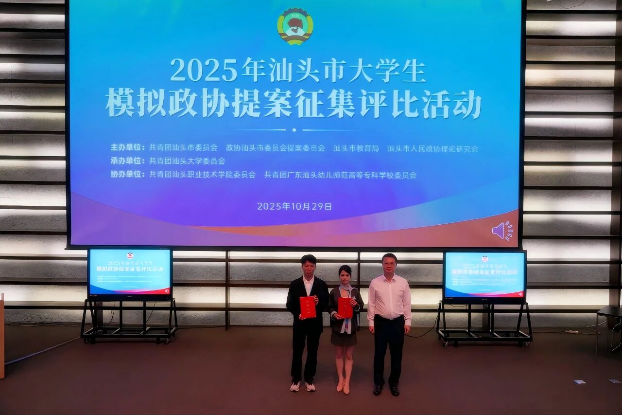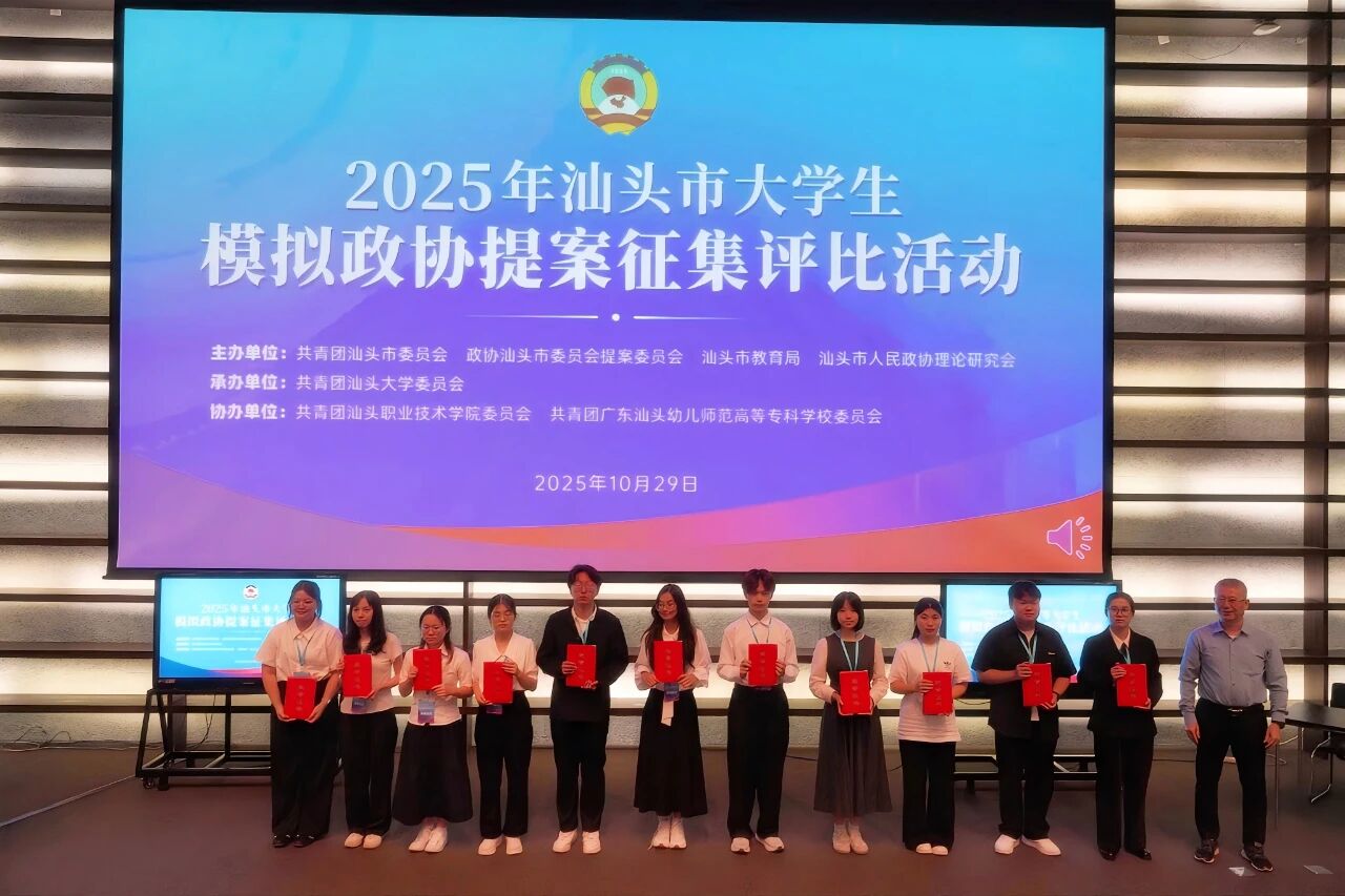 10月29日下午,由团市委、市政协提案委、市教育局、市政协理论研究会联合主办的2025年汕头市大学生模拟政协提案征集评比活动现场展示评比及颁奖仪式在汕头大学举办,来自汕头大学、汕头职业技术学院、广东汕头幼儿师范高等专科学校的大学生团队代表现场展示竞逐。市政协副主席黄立飞、汕头大学党委副书记周镇松出席活动并讲话,市政协、团市委、市教育局等有关部门及各相关高校负责同志参加活动。